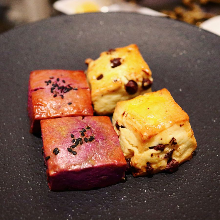 紫芋とチョコチップの2種類のスコーンに、クロテッドクリームと2種類のジャムがそえられますが、紫芋のスコーンが特に秀逸で、紫芋の自然な甘みが広がり何も付けずにそのままで絶品でした。