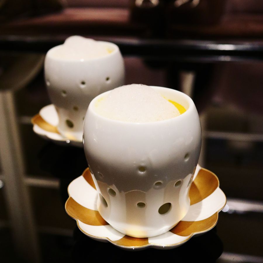 こちらは、ホテルのフレンチレストランの吉本シェフの特製で、濃厚なカボチャのスープにミルクエスプーマを乗せ上品でまろやかな味わいに仕上がっています。