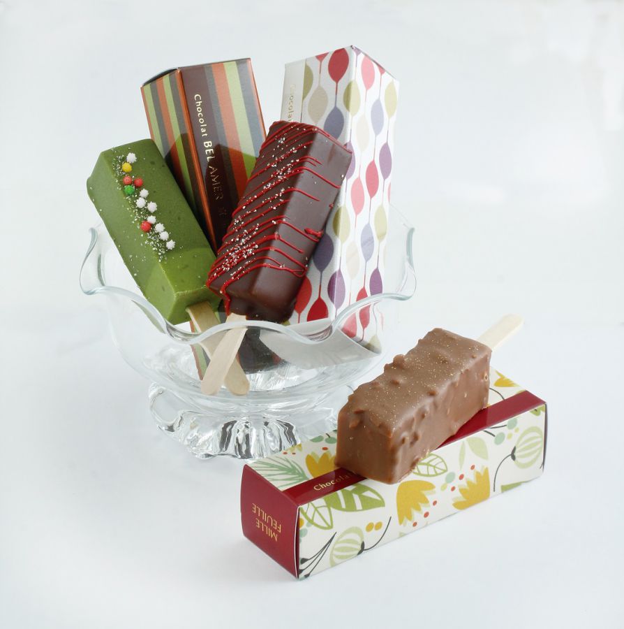 「ベル アメール 京都別邸」の看板メニューともいえるのが、この「スティックショコラ」。棒つきで食べやすく、食べている姿まで美しく見えてしまうチョコレートです。