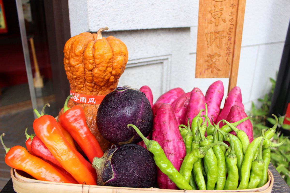 この日の野菜は、加茂ナス、鹿ケ谷かぼちゃ、伏見唐辛子、赤万願寺など。お店の前にディスプレイされている野菜たちが、その日使われる材料です。