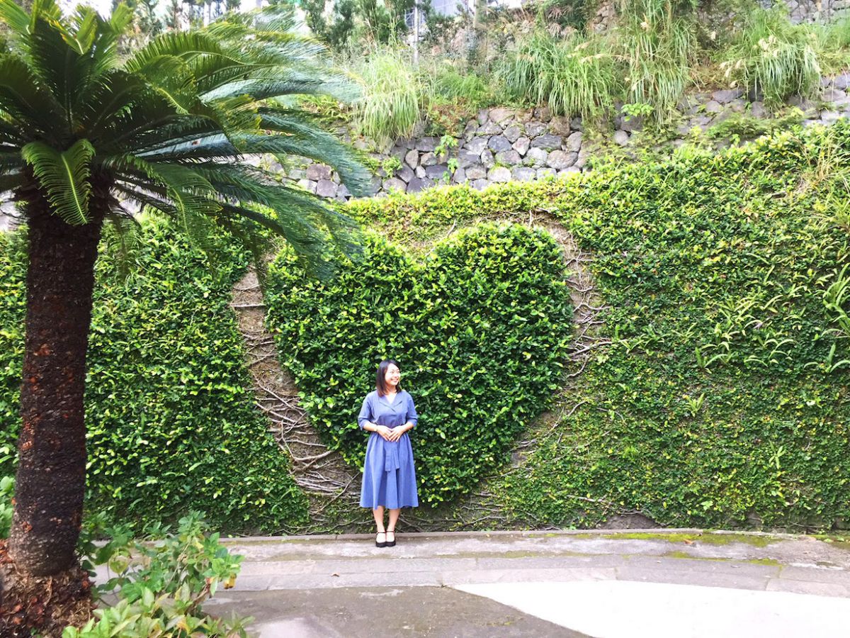 入り口にある名物のハートリーフ。来場者のみなさんに喜んでもらいたいという思いから、庭の植え込みをハート型に剪定したものなのだとか。近くの大学に通う女子大生の口コミから人気に火がつき、今では結婚式の前撮りや観光客、修学旅行生なども訪れる話題の撮影スポットです。
