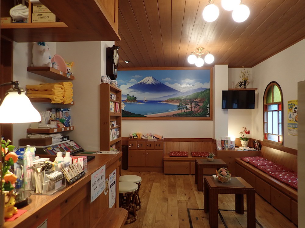 ロビーや浴室の窓はステンドグラス。壁は漆喰。天井や床、ロッカーや籠まですべて木材をあしらったタイムスリップしたような温かみのある空間です。耳をすますと“ひぐらし”の声。床には池に鯉が泳いでいます。なんと、虫や鳥の声や鯉の様子を春夏秋冬にあわせてデジタルサイネージで表現しているのです。銭湯なのにまるで自然の中にいる気分。日本で数人しかいない銭湯絵師が描いた“富士山絵”も必見ですよ。ちなみに、アメニティもバッチリ揃っているので手ぶらでもOK。