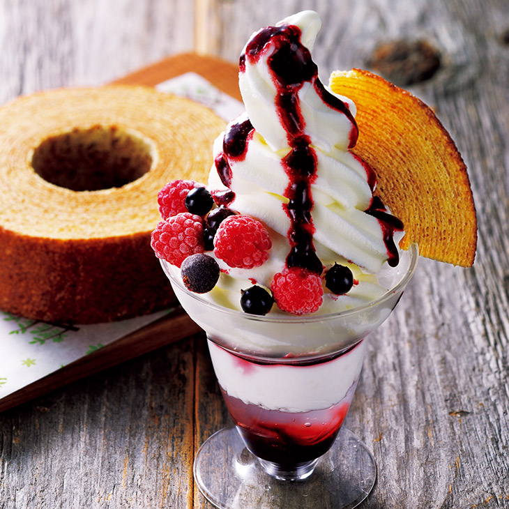 特選よつ葉発酵バター香るバームクーヘンがトッピングされた、札幌・石屋製菓「ISHIYAパフェ~なまらバターバウム TSUMUGIを添えて~」756円(※各日限定300カップ)。甘酸っぱい2種のベリーと白い恋人ソフトクリームの相性も抜群!