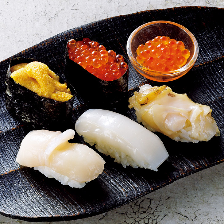 秋鮭のいくらをはじめ、人気のネタがずらり!札幌・鮨処 竜敏「旬の蝦夷握り(5貫・いくら小鉢、1セット)」2160円。※提供は10月3日(水)~9日(火)、各日限定50セット
