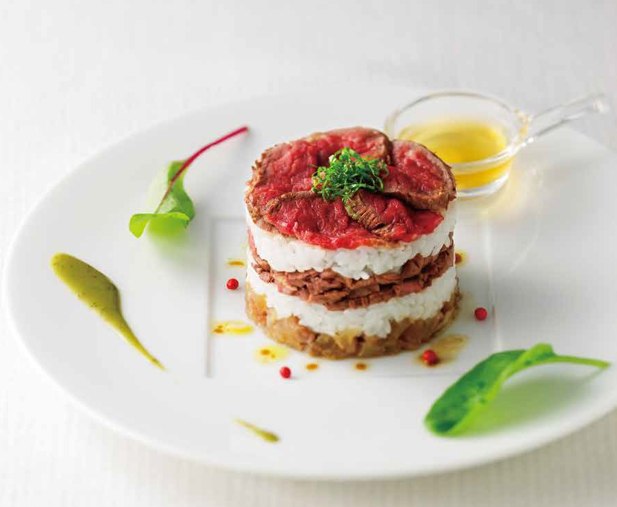 函館・レストラン箕輪の「おぐに和牛のミルフィーユ」1944円 は、ローストビーフと焼肉、すじ煮込みを3層にした贅沢なメニューです。※イートイン限定・各日100食限り