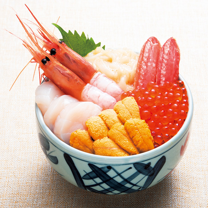 海鮮6種を贅沢に盛り付けた、函館朝市 いくら亭の「函館 大漁丼」2592円。見た目にもとっても豪華です。※各日限定100杯