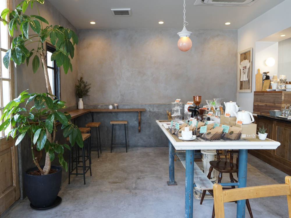 ドアをくぐればコンクリートの空間に、木の風合いが温かい家具が並んでいます。コーヒーの香りに包まれて、心落ち着く雰囲気。