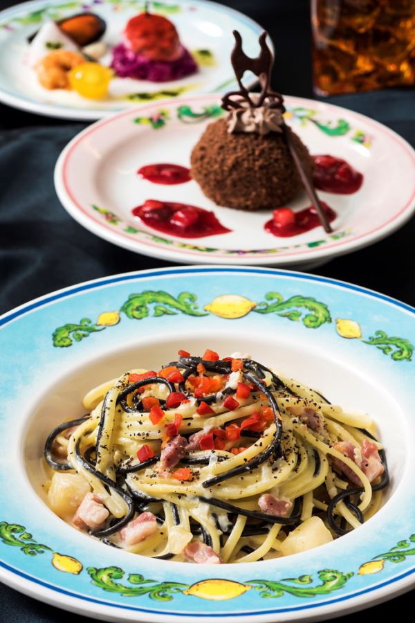 前菜は『白雪姫』に登場する魔女が持つ毒りんごと白雪姫をイメージ。メインは白と黒の2色の麺をホワイトソースで和えたパスタ。赤いパプリカを散らして『101匹ワンちゃん』のクルエラ・ド・ビルを表現!デザートのチョコレートムースケーキは『眠れる森の美女』のマレフィセントをイメージ…とまさにヴィランズづくし。
