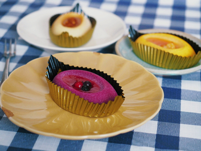 ケーキのような見た目のこちらがそう、フランスからやってきたアイス職人、ヴェスマエル氏発案のスイーツなんです。その名も「カラー芋・アラモード」(3つセットで1150円)!
