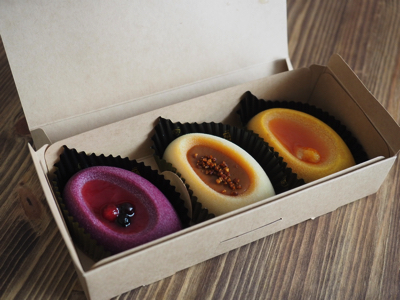 3つのフレーバーが用意されており、左から「紫芋のショコラベリー」、「黄金芋のアーモンドキャラメル」、そして「紅芋のオレンジコアントロー」になります。155種ある「唐芋」のなかから厳選した品種を、それぞれのフレーバーにあわせて使っているのだそう!