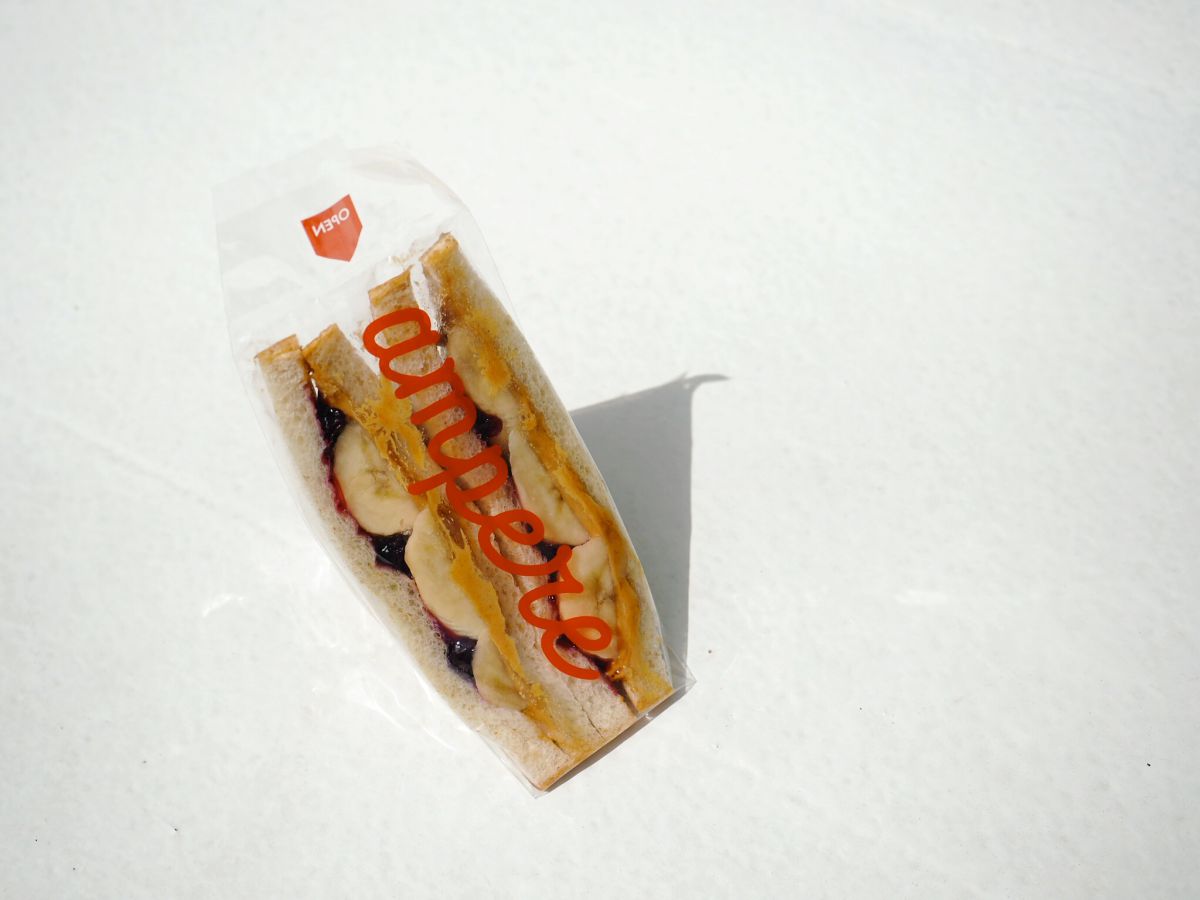同じデザートサンドで年間を通して楽しめるのが「ピーナッツバナナ&ブルーベリージャム」(480円)!甘酸っぱいブルーベリージャムに、塩気の効いた濃厚でまったりとしたピーナッツバター、そしてとろりと甘く熟したバナナがふかふかのパンとともに口の中へ入ると…想像を超えるおいしさにびっくり!これはクセになる味わいです。