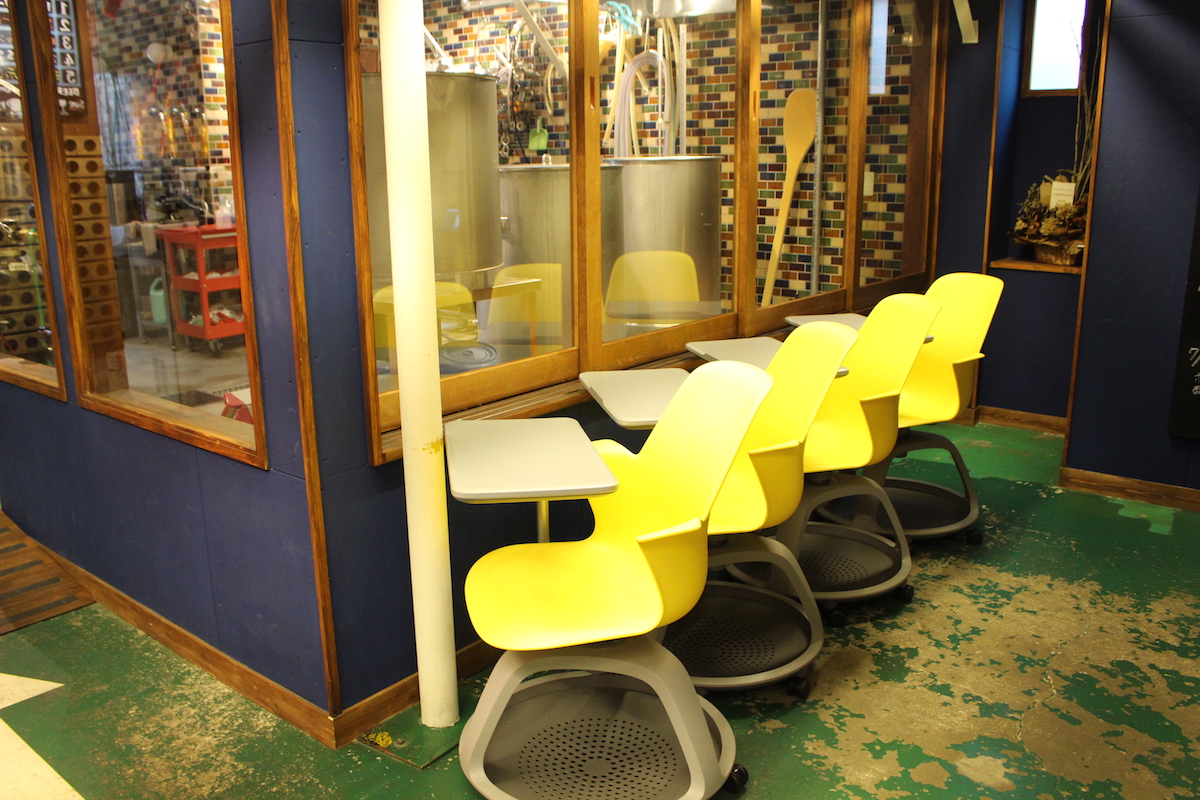 醸造所の前には一人用の席も用意されているので、ビールが作られる様子を眺めながらくつろぎの一杯を楽しむことも。なお、醸造は毎週水曜と土曜の9〜18時に行われます。
