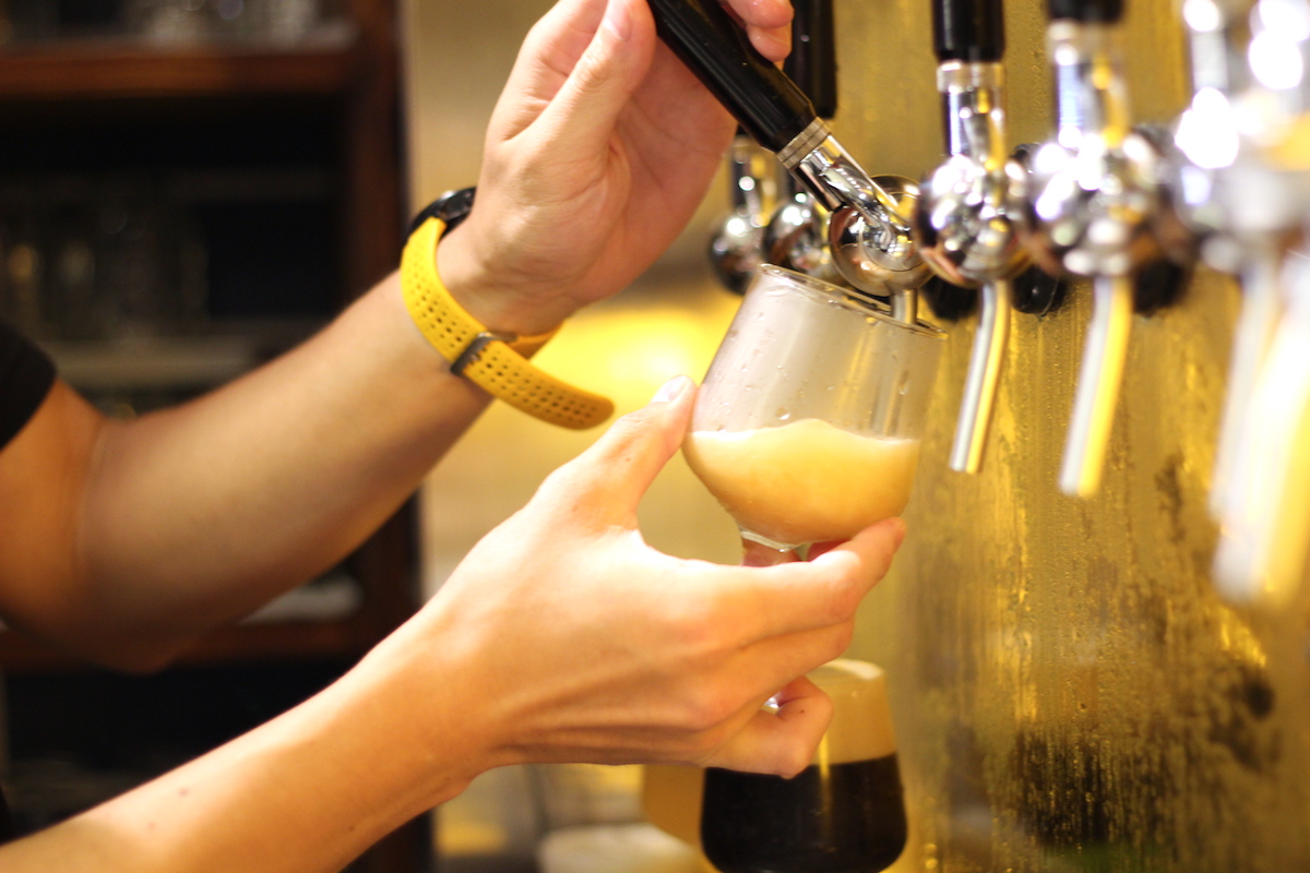 「オリジナルクラフトビール」は常時「白」「黒」「琥珀」「IPA」「限定」の、5種類をラインナップ。新鮮かつキンキンに冷えたビールを、絶妙な手さばきでビールサーバーから注いでもらえます。