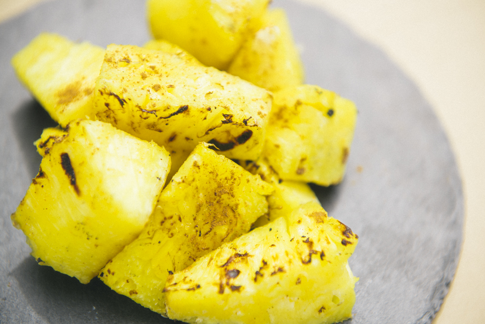 最後はデザート。缶詰のパイナップルを焼くだけですが、想像以上にジューシーです。お好みでシナモンをふりかけてどうぞ。
