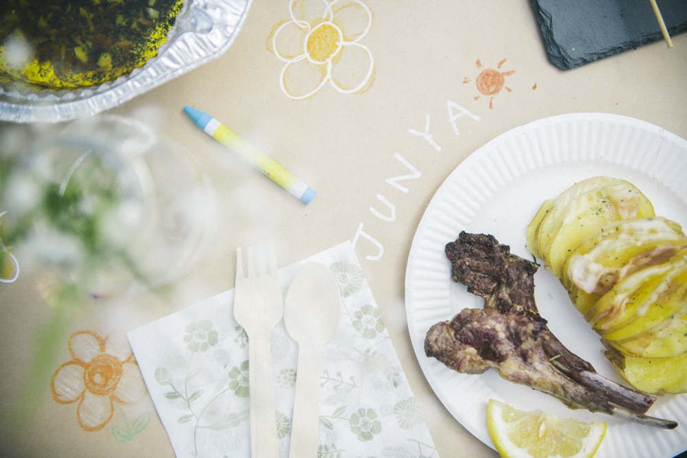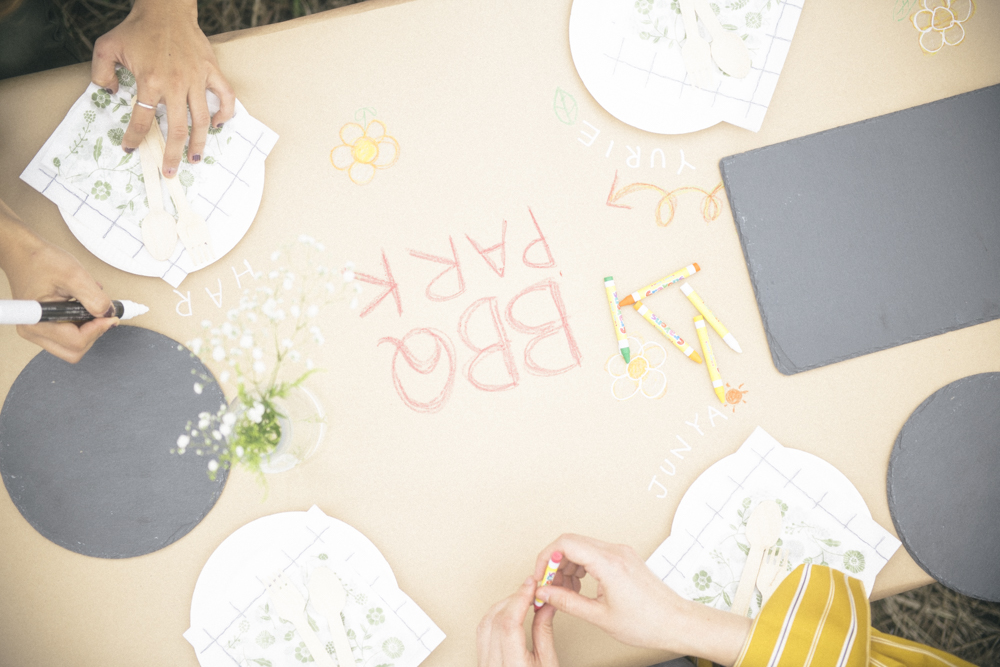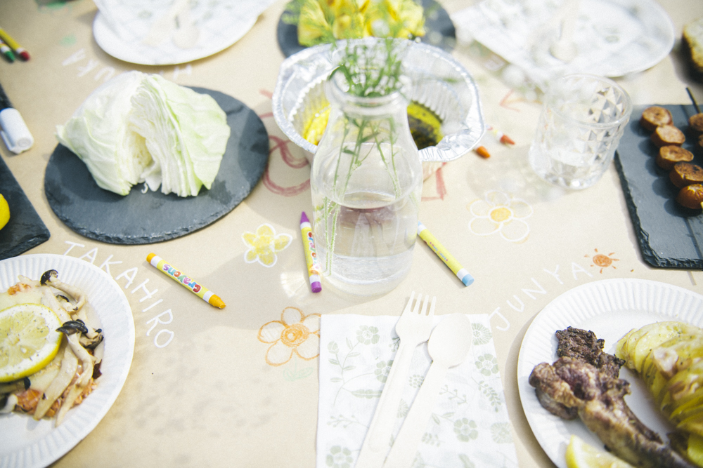 レシピ以外のお楽しみがテーブルコーディネート。BBQグリルやテーブル、チェア、紙皿など、必要な機材や消耗品はもちろん宅配してくれますが、それにプラスして、紙ナプキン、木製のカトラリー、スレートプレート、テーブルクロス代わりにクラフト紙と、セットでクレヨンも用意しました。