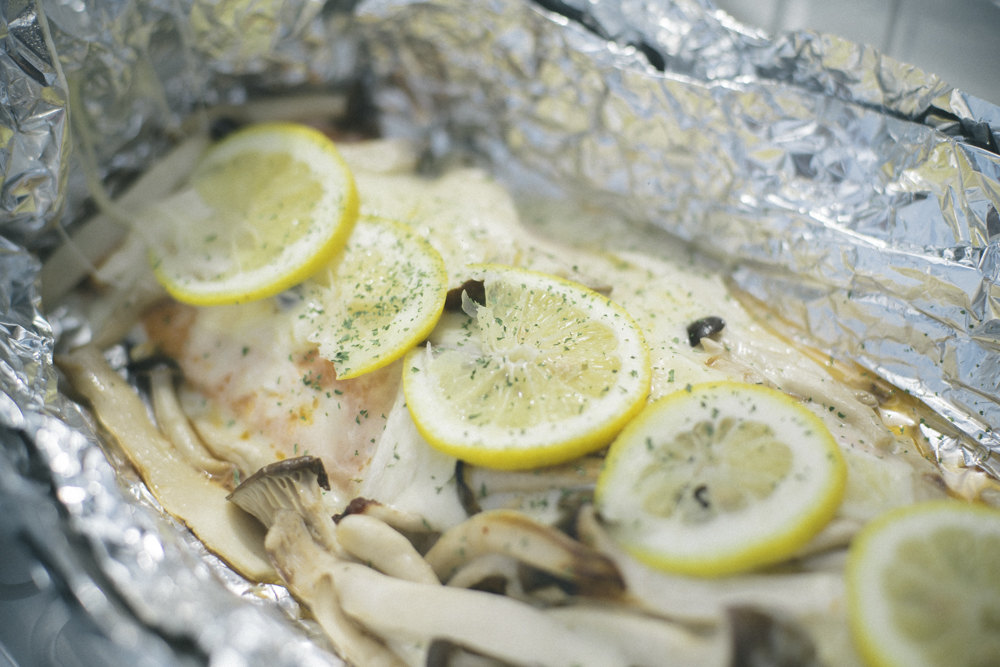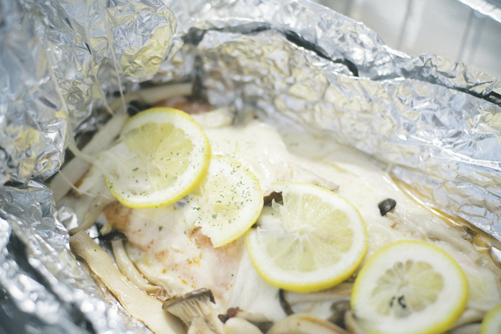 ホイルで包んでふたをして、グリルにのせて焼くだけ。最後にレモンとパセリをのせれば完成です。とっても簡単♪