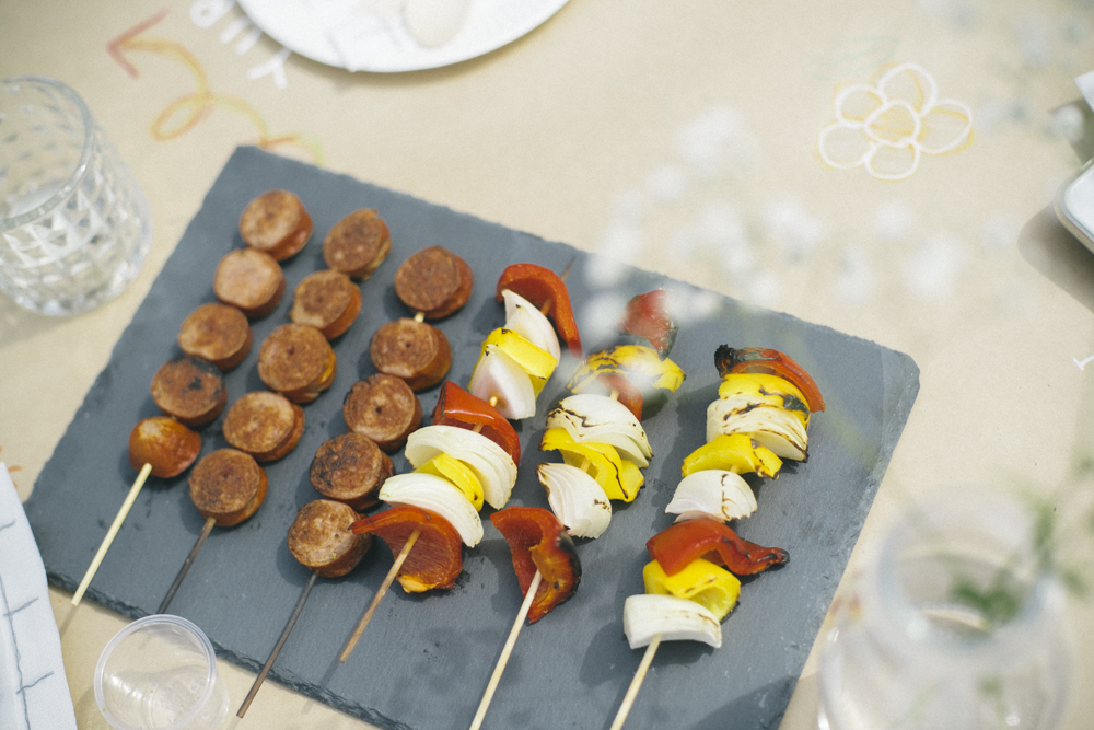 ソーセージとカラフルな野菜の串焼きは、BBQの定番的存在。ソーセージは輪切りにして丸い面を見せると、かわいい印象になります。食材の大きさと色合いのバランスも考えて、串にさしていきましょう。