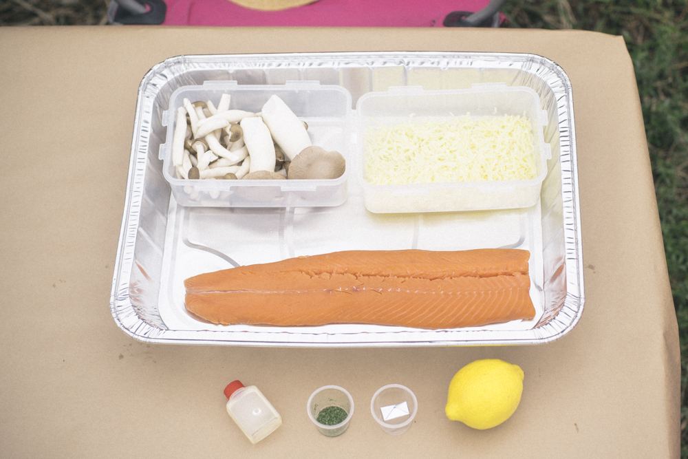こちらは、「きのことサーモンのホイル焼き」のセット。このような形で材料が届きます。レシピに必要な分だけの食材と調味料がセットされているので安心!付属のレシピの手順に沿って調理してくださいね。ただ焼くだけのBBQではなく、調理する過程もみんなで楽しめます。