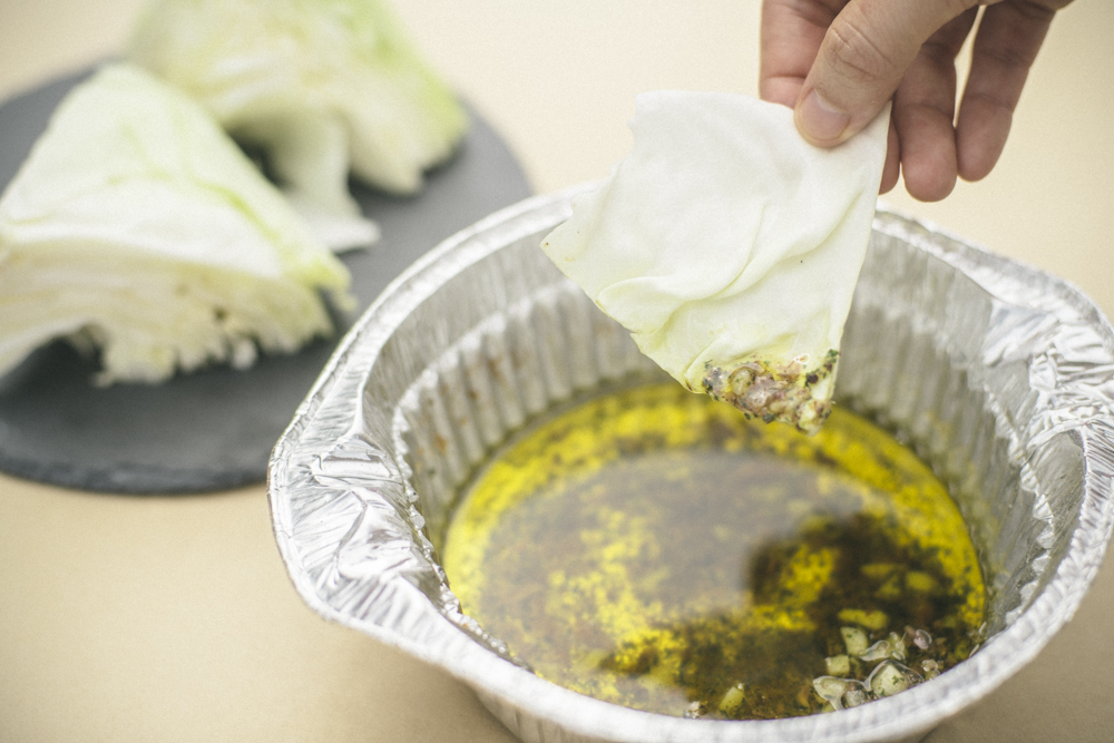 オリーブオイルにアンチョビとニンニクを入れたらグリルの上で煮詰めて、あとはキャベツをつけるだけ。箸休めにぴったりの1品は、アンチョビが香ばしくて美味しいです。お酒のおつまみにぜひ。