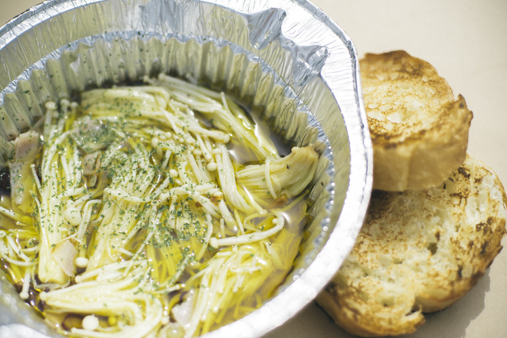えのきをたっぷり入れたアヒージョは、パンが止まらなくなる美味しさ。フランスパンはグリルでさっと炙ると、BBQならではの香ばしい味わいに。焦げには注意です!