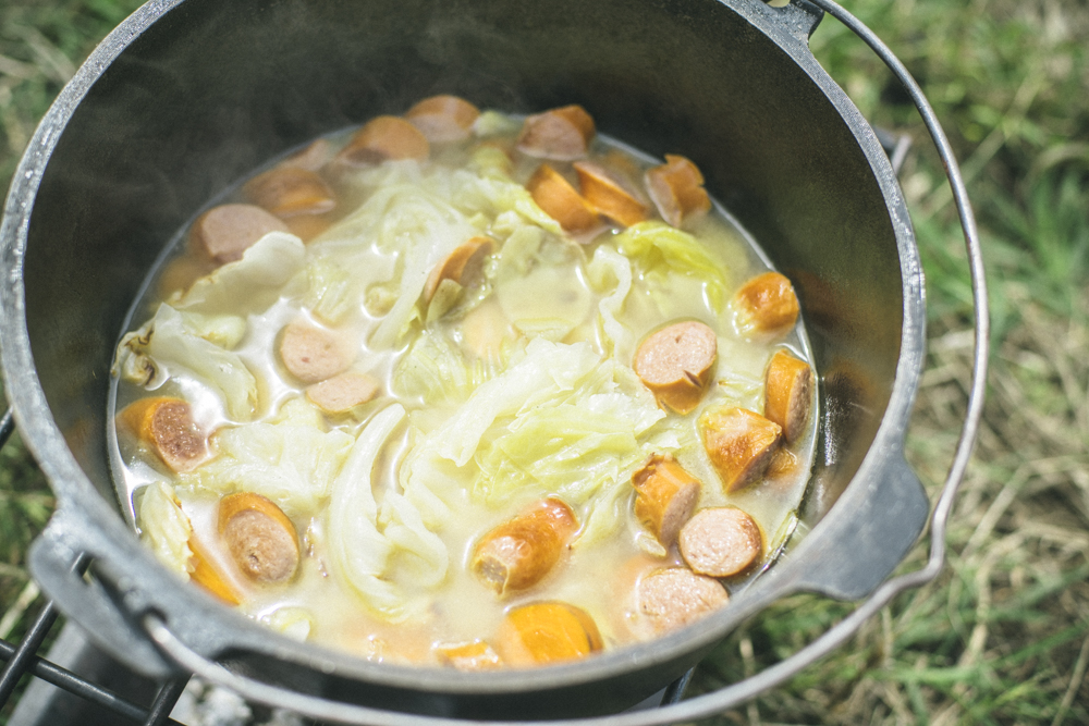 外ごはんに嬉しい、体が温まる具だくさんスープ。BBQのしめにどうぞ。ほかのメニューで余った材料を足してみるのも楽しいですね。