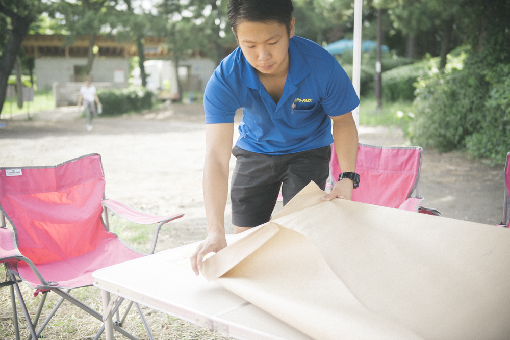 テーブルに今回のプランについてくる、クラフト紙も貼ってくれます。白いシンプルなテーブルがナチュラルテイストに早変わり。女性だけでは立てるのが大変なタープテントも設置までしてくれるので、安心。小雨でも十分雨除けになりますよ。