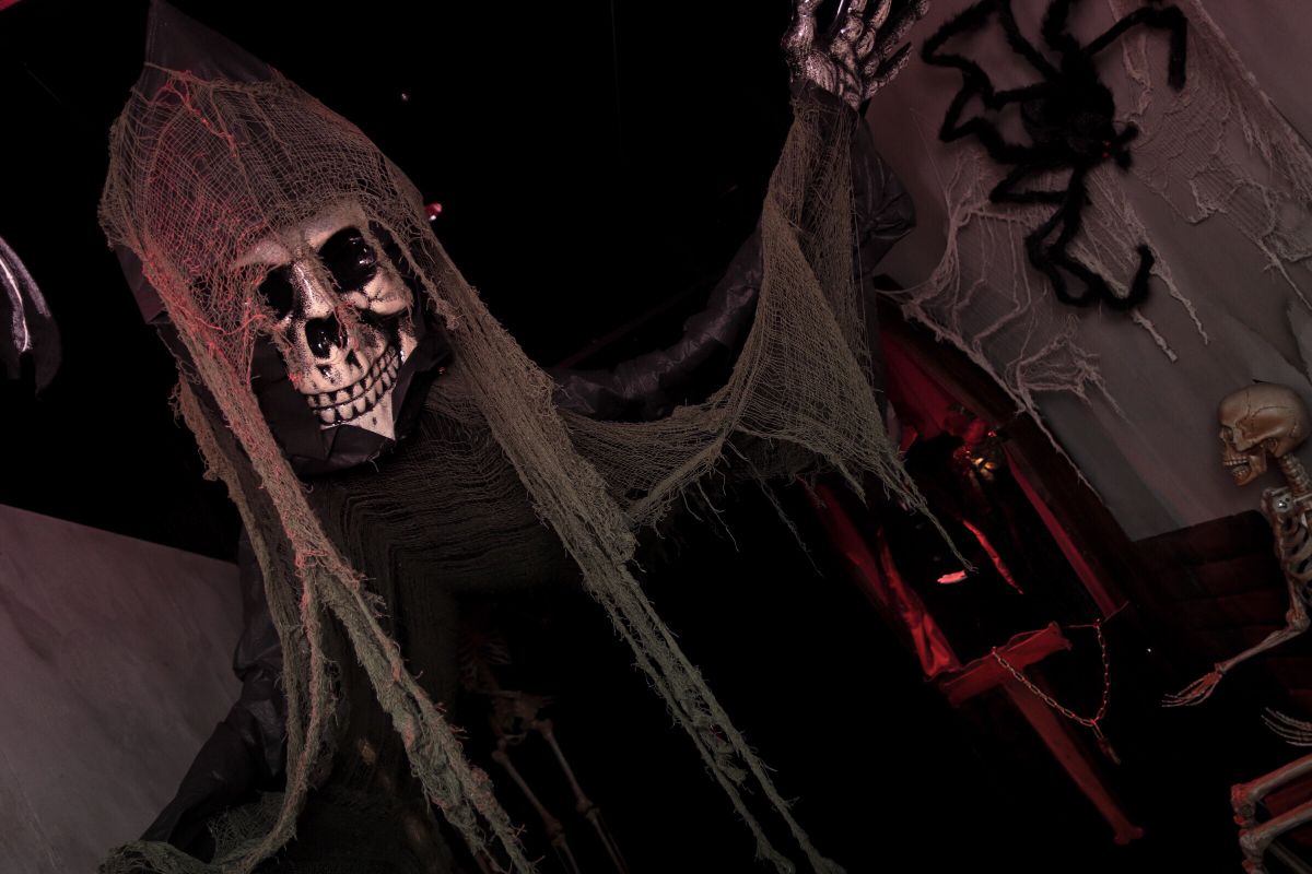 カーテンを開くとすぐに大きな死神が。奥にはドラキュラや、少女の肖像画など不気味な装飾品が出迎えてくれます。