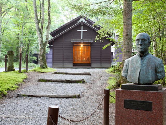 にぎやかな旧軽井沢銀座通りを抜けたエリアにある礼拝堂。軽井沢開発の父と呼ばれる宣教師A・C・ショーの銅像も立っています。木立に囲まれた静かなたたずまいに、心安らぐひとときを過ごすことができます。
