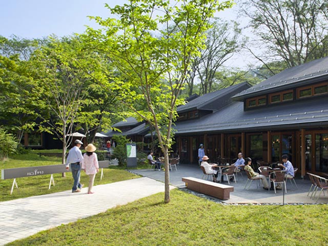 ハルニレテラスは、9棟の建物を広々としたウッドデッキでつないだ「小さな街」。ハルニレの木立に囲まれ、高原リゾートの雰囲気がたっぷり味わえます。地元の人気カフェやベーカリー、そば処、雑貨店など16店があり、洗練されたショップばかりでどの店もじっくり見入ってしまうはず。いま、大注目のスポットです。