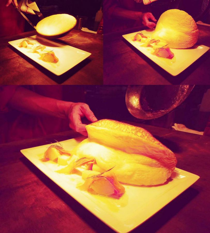 5分ほどで焼き上がり、いよいよ盛り付け。見てください、このふわふわと膨らんだオムレツを!オープンキッチンなので、目の前で盛り付けの瞬間を見ることができます。焼き上がったスフレオムレツをお皿に移す瞬間がシャッターチャンスですよ!