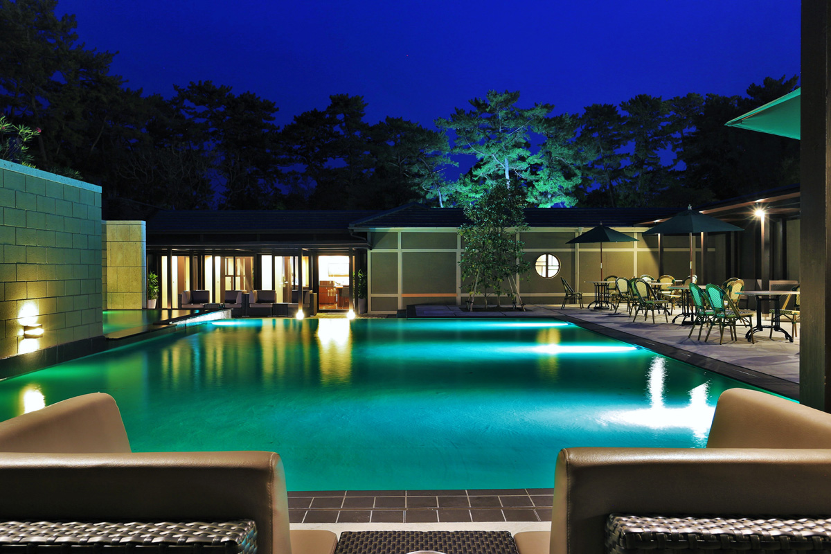 海沿いの絶景を見晴らす3500坪の敷地内には、客室がたった17室。贅をつくした非日常空間を味わえるホテル「GAHAMA terrace」です。敷地内には元・久留米の有力者の別荘だった歴史ある建物が残されており、伝統とモダンが融合した、スタイリッシュな海辺のリゾートになっています。