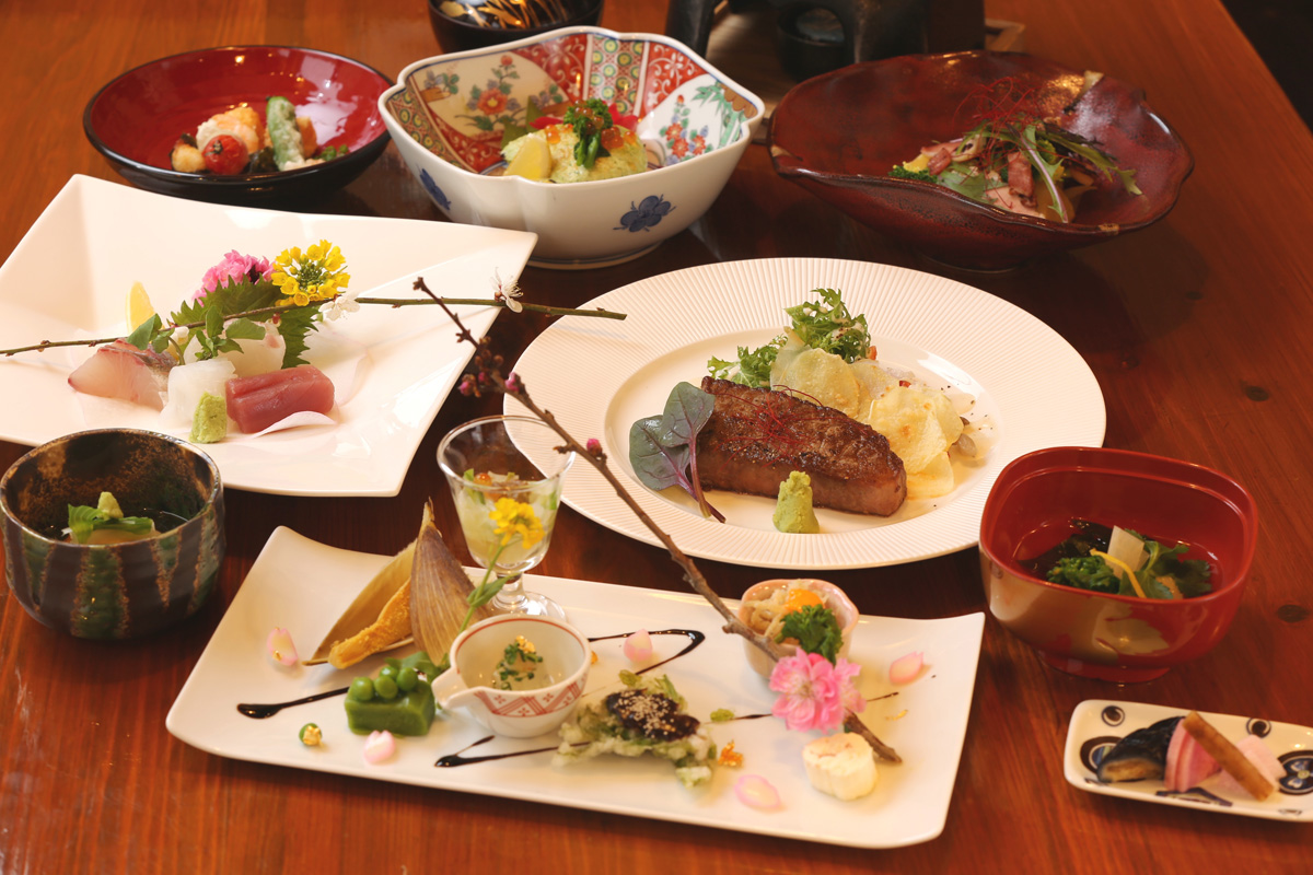 提供されるのは、“地元の厳選された食材を使って、食事の時間を華やかに演出する”という花灯りの料理長のこだわりのもと、旬の幸を贅沢に使った創作和会席。女子ゴコロをくすぐる見た目も鮮やかな料理が並びます。完全個室の食事処のため、客室同様プライベートな空間でおいしい料理が堪能できます。