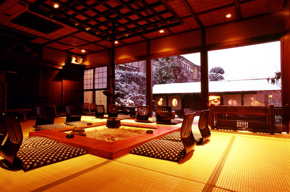 大分県の食材を使った体にやさしい料理を味わって、絶景の露天風呂を楽しんだ後は、ゆっくりとくつろげる囲炉裏のある休憩処で由布院の冷水のサービスを。夜は談話室として自由に利用できる休憩所は、懐かしい日本の和情緒を満喫できます。