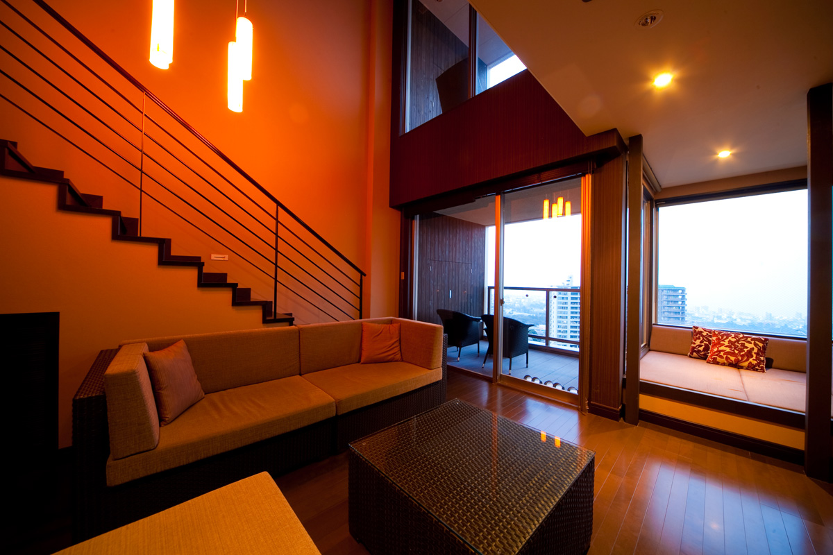 新館「月ノ想」にはメゾネットタイプの部屋もあり、上の階には露天風呂とツインベッド、下の階にはリビングルームと和室というゆったりした造り。それぞれの部屋の窓や露天風呂からは別府市内と別府湾が一望でき、見晴らしも抜群です。