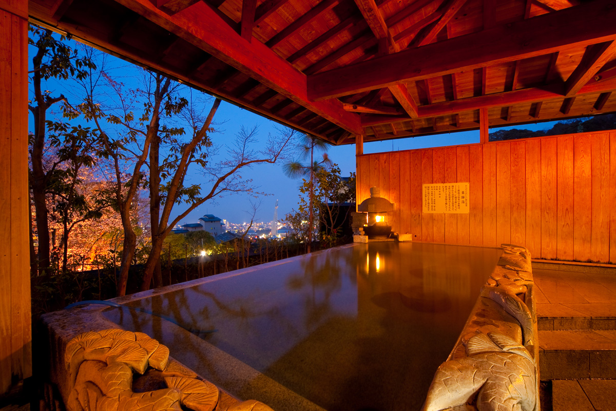 本館内にある「薬師の湯」は、中国で発掘された巨大な一枚岩からできていて、ほどこされた彫刻は一見の価値あり。無色透明の湯は、飲むこともできるので、温泉をまさに全身で満喫できます。温泉から眺める別府のうつくしい街並みもまた、忘れられないひとときを演出してくれます。