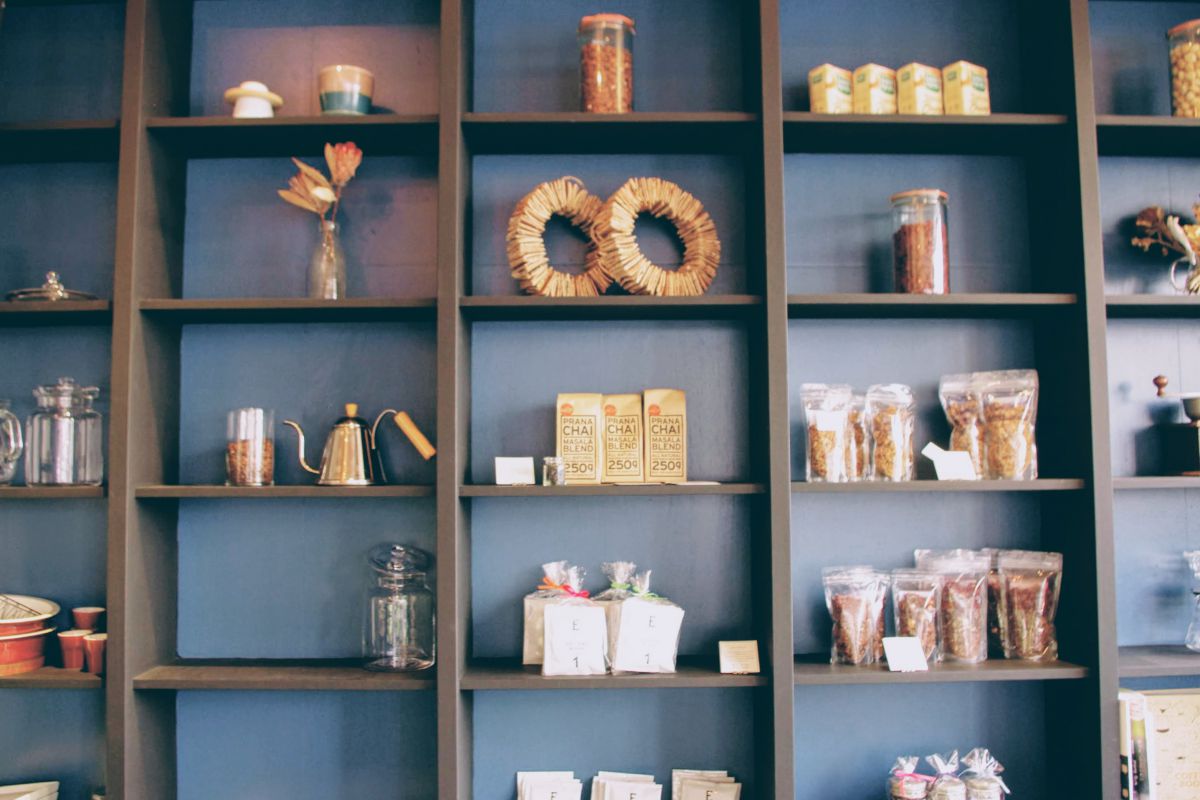 壁一面のブルーの棚が特徴のこの店も、注目されるカフェのひとつです。