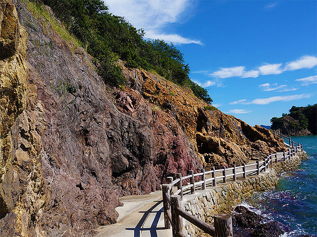 鞆の浦から渡し船で約5分。目と鼻の先にある仙酔島は、太古の自然がそのまま残る日本最初の国立公園。世界でも珍しく、日本ではここでしか見ることができないといわれる、5色(青・赤・黄・白・黒)の岩が連なる「五色岩」があり、不思議なパワーが宿るといわれています。仙人も酔ってしまうほど美しい、神秘的なパワーアイランドで極上の癒しを体感。
