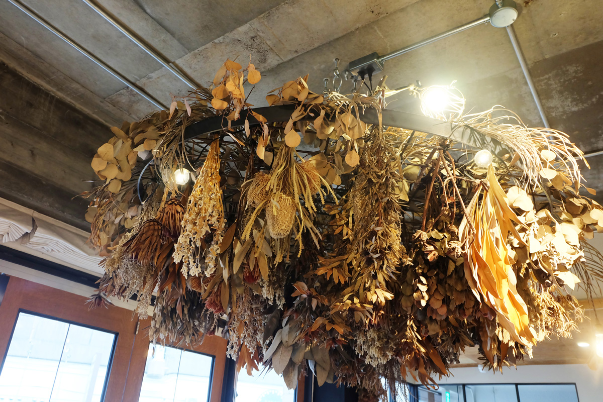 おしゃれな店内の天井には、迫力満点の大きなドライフラワーが印象的!ついつい写真を撮ってしまいたくなる空間が広がっています。
