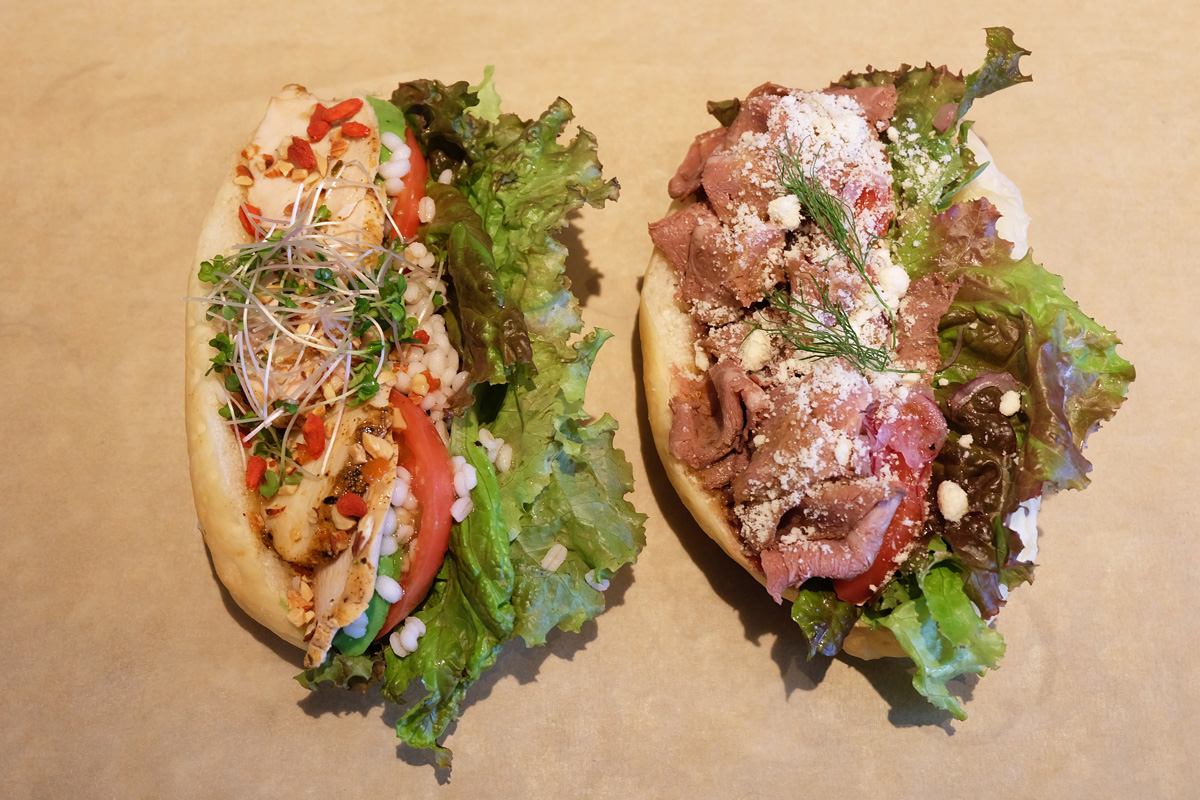 たっぷりと具材を詰め込んだサンド。左は、もち麦やクコの実など6種のスーパーフードを取り入れたスパイシーチキン(950円)。右は、ボリュームたっぷりのローストビーフ(950円)。セットメニューもあり、11月からは温かいスープも登場します。