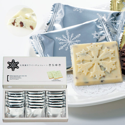 カカオ豆をフライローストして粗挽きにしたカカオニブをチョコレートをブレンドしています。チョコレートと粗挽きカカオニブの絶妙な食感。雪をイメージしたパッケージも人気です。