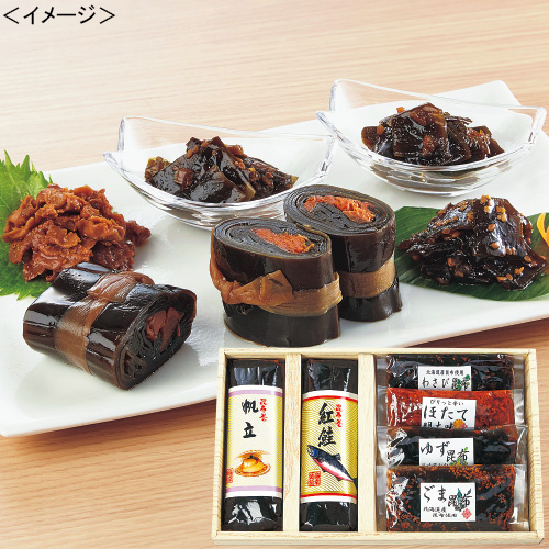 - 内容量:ゆず昆布90g、ゴマ昆布80g、ほたて明太80g、わさび昆布茶漬け90g、昆布巻紅鮭150g、昆布巻帆立150g