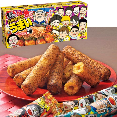 たこやきソース味のうまい棒。3種類の袋デザインがランダムに入っています。18本入りなので、職場でのお配りお土産にぴったりです。