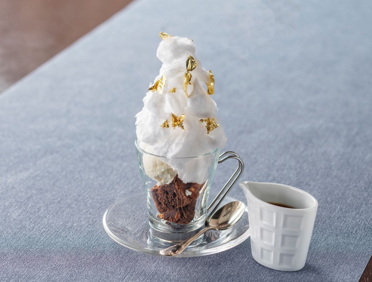 おいしいご飯の締めは、やっぱりスイーツですよね!ぜひ味わってほしいのが、こちらの「コットンキャンディーアフォガード」(600円)。ひと口サイズのチョコレートケーキとバニラアイスの上に、ふわふわのコットンキャンディーと金箔がトッピングされています。これに温かいコーヒーをとろりとかけていただきましょう。