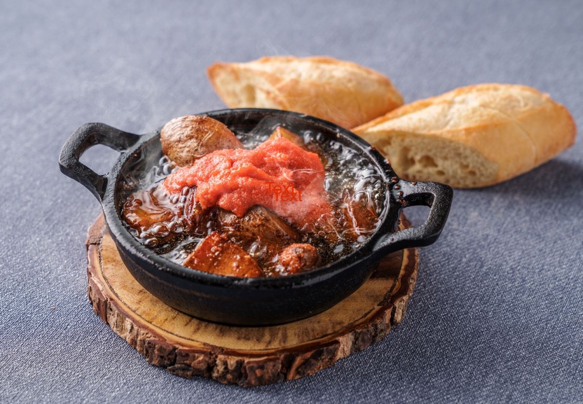 こちらが「明太子とジャガイモのアヒージョ」(600円)。ホクホクとした甘いじゃがいもに、ピリッとした明太子の辛さがマッチ!オリーブオイルとガーリックのコクで、食材のおいしさが一層引き立ちます。最初のオーダーにぴったりなポーションで、乾杯のワインとあわせたい1品です。