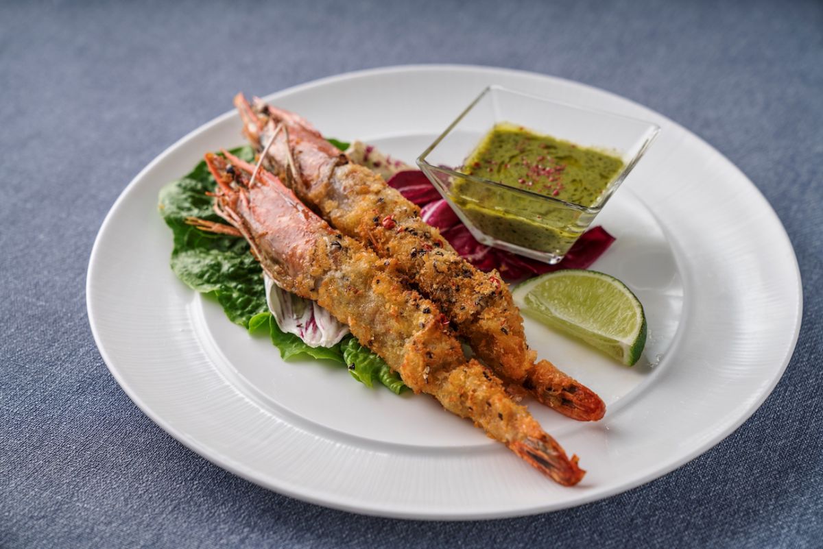 続いてこちらが「大海老のクワトロペッパ―フライ」(1300円)。こんなおしゃれな海老フライ、見たことがありません…!胡椒がきいたサックサクの衣に、おおぶりの甘い海老が包まれています。添えてあるライムを絞って特製のソースにディップすれば、もうたまらないおいしさ!白ワインと一緒にじっくり楽しみたい逸品です。