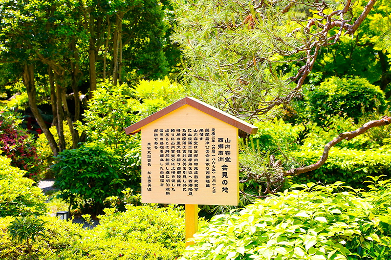 高知城下にある高知の名温泉旅館。敷地内には国の重要文化財に指定されている旧山内家下屋敷長屋を擁し、幕末ファンの観光スポットとしても知られています。西郷は実際にこの場所を訪れ、土佐藩主・山内容堂公と会談しました。