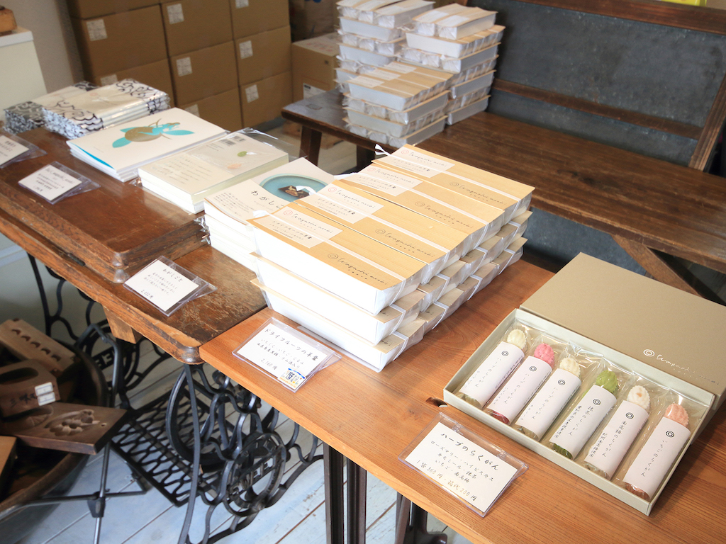 店内に入ると、入り口に置かれたデスクの上に「ドライフルーツの羊羹」と「ハーブのらくがん」が積み上げられています。その脇には「wagashi asobi」の関連書籍や、代官山の手ぬぐい専門店「かまわぬ」とコラボレーションしたオリジナル手ぬぐい(2160円)も。