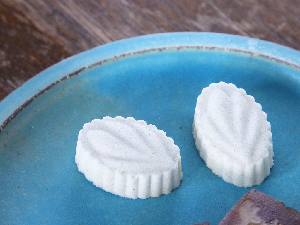 「ハーブのらくがん」(360円/1袋・4粒入り)は、稲葉さんがニューヨークで食べたチキンにのっていたローズマリーが創作のヒントになったのだとか。ハーブと和菓子の組み合わせを試行錯誤して生み出された、オリジナルの和菓子です。