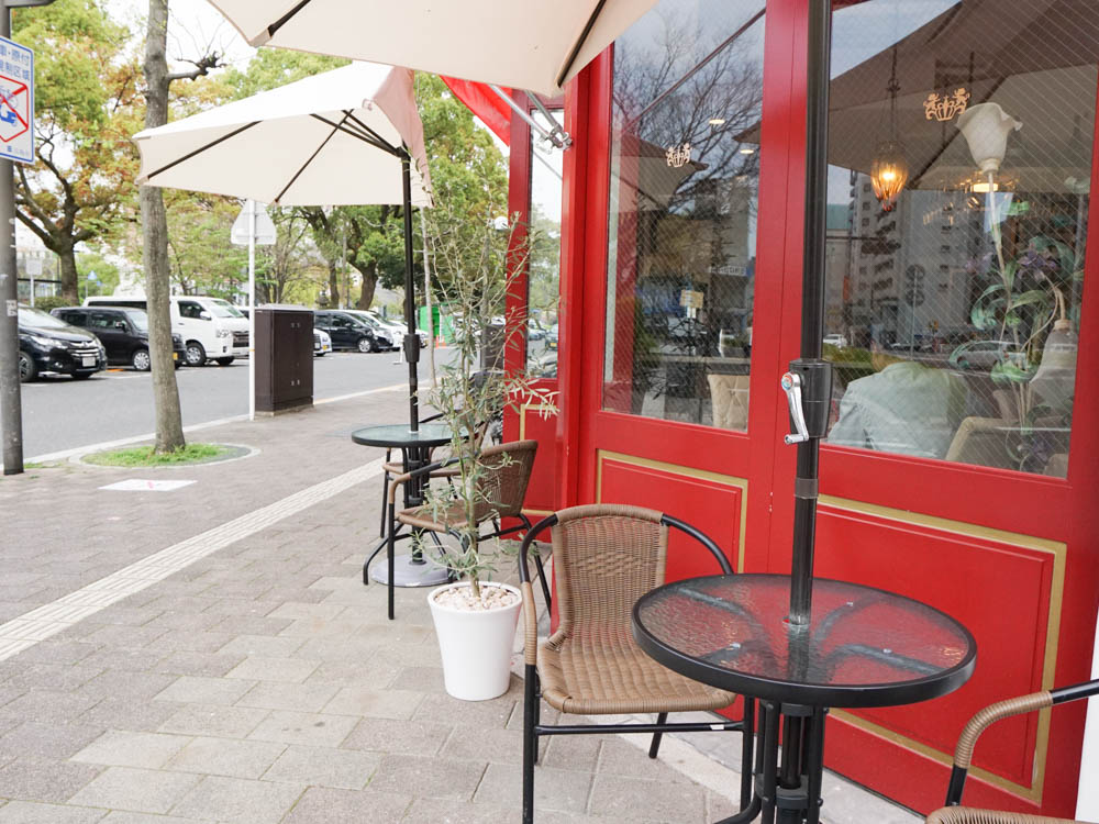 じぞう通りを進むと見えるのは、真っ白な壁に赤い屋根と扉が映える、オシャレなカフェ。その外観はまるで地中海地方に来たかのよう。