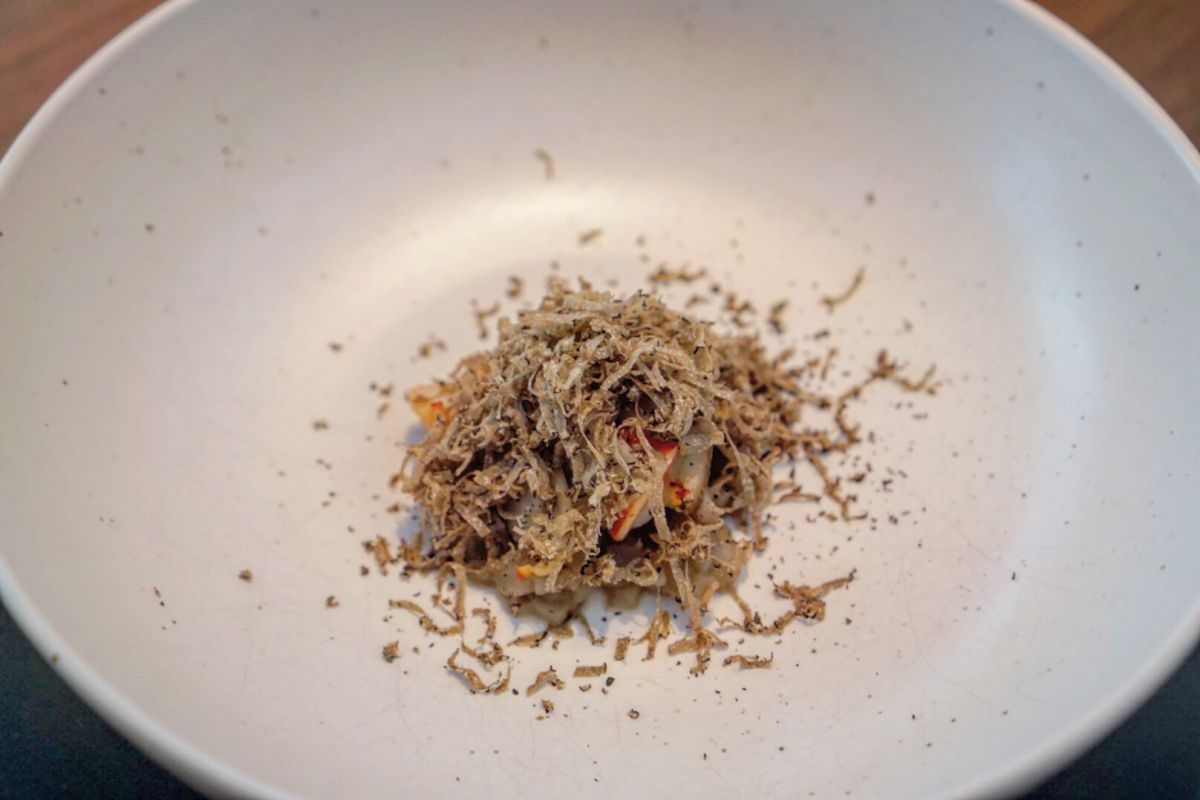 たっぷりの牛蒡と、肉厚なロブスター。ここにスープを注ぎます。